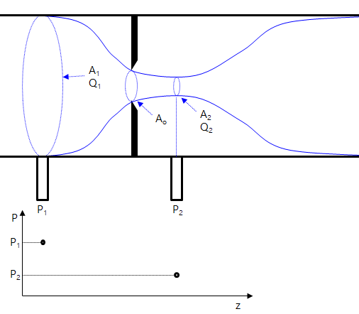 오리피스의 기본적인 원리는 베르누이의 방정식으로 설명할 수 있다. 오리피스에서는 유체가 구멍을 통과할 때 단면적이 감소하므로 속도가 증가하고, 그에 따라 압력이 감소한다. 따라서 오리피스 전후의 압력 차이를 측정하면 유량을 구할 수 있다. 하지만 베르누이 방정식은 아주 이상적인 상황에서 유도된 방정식이라 유동에서 발생할 수 있는 손실은 고려가 되지 않았으며, 더군다나 오리피스의 형상이 유동을 급격하게 변화시키는 형태라 벤츄리나 노즐에 비해 상대적으로 큰 압력손실을 야기한다. 따라서 오리피스에는 베르누이 방정식을 그대로 적용하기에는 오차가 너무 크기 때문에, 여러 계수를 곱해서 보정해야 한다. 보정을 위한 계수는 오리피스의 형상과 위치, 유체의 물성 등에 따라 달라지며, 실험적으로 구한다.