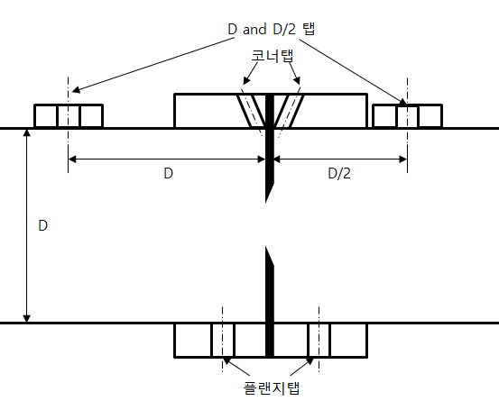 - 코너탭(Corner tap): 오리피스 플레이트의 모서리에 압력센서를 설치하는 방법이다. 이 방법은 오리피스 플레이트의 크기와 파이프의 직경에 관계없이 사용할 수 있다. 하지만 압력센서가 오염될 가능성이 높고, 정확도가 낮다.